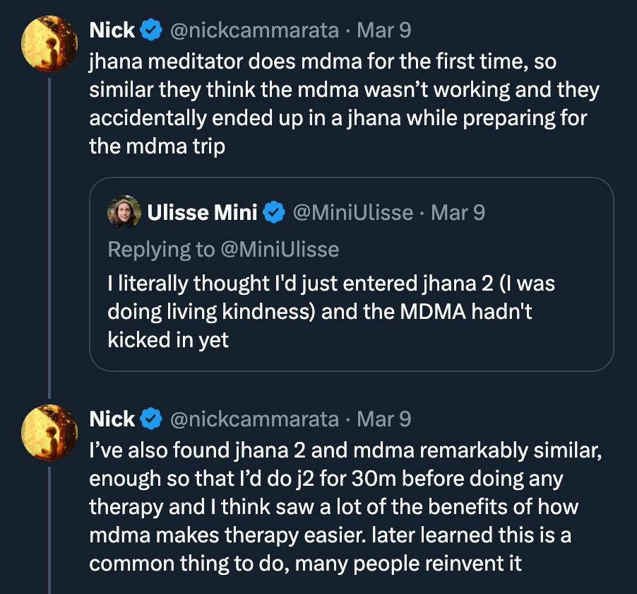I want to emphasize that these are not just mildly positive experiences; practitioners consistently report feeling the most joy/peace they’ve felt in months or years. In fact, it’s pretty common for meditators to compare J2 and MDMA. For reference, here’s a beautiful quote of the MDMA subjective experience: