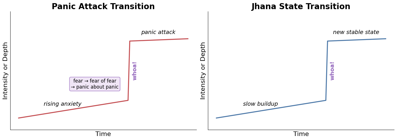 (3) Then, the surprising empirical result (i.e. what we surprisingly observe in advanced meditators) is that with enough stability/continuity of positive emotion, there’s a sort of step jump or inflection point where it grows exponentially, into a profoundly positive state. This is measurable4, not just subjective report, but it’s still kinda hard to believe if you think about it like an exotic meditative state — I think it’s way more believable if we again compare it to the familiar case with negative emotions. We know it’s totally possible to have panic about panic that “takes off” exponentially; we call this a panic attack. It just turns out we can learn how to do a similar thing but for positive emotions; we can learn the skill of having a love attack, a happiness attack, a peace attack. And this is what is called a jhana!