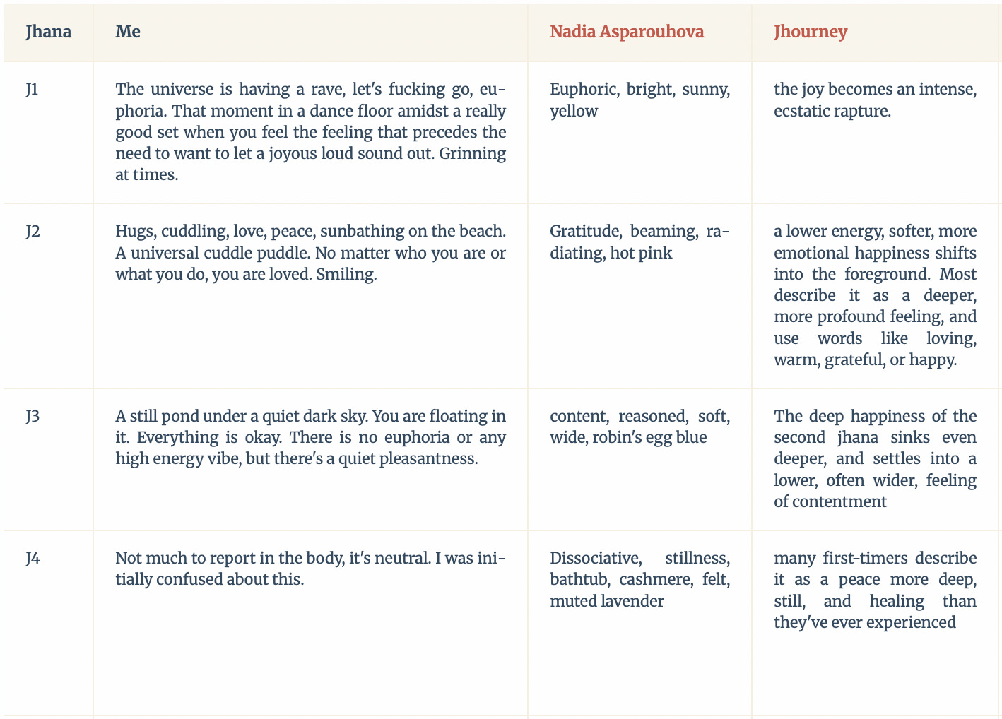 The first four categories of jhana experiences (denoted J1 to J4) feel really, really, really good. Here are some descriptions from meditators!