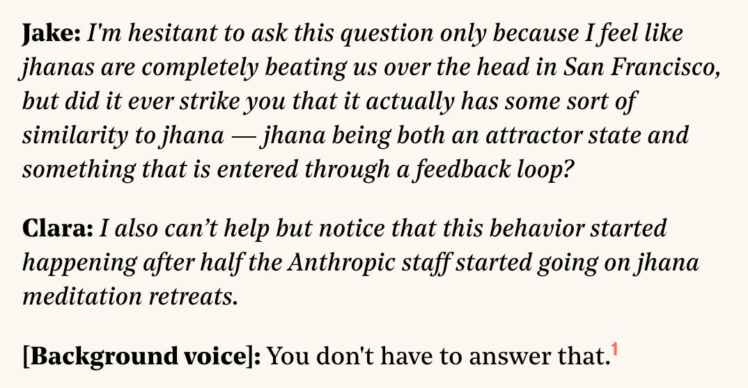 One small example is that many Anthropic staff members have gone on a “jhana” retreat.