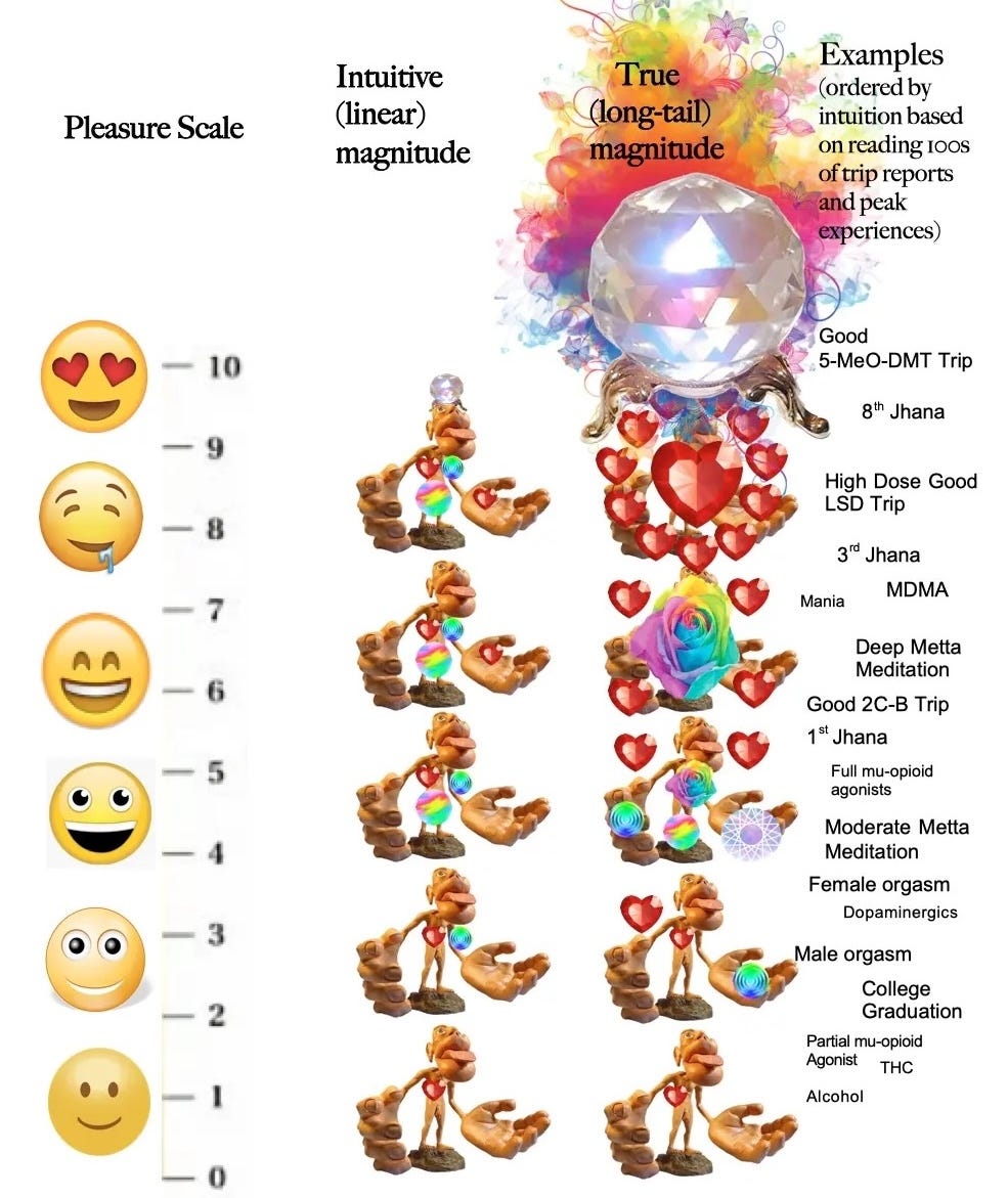 I also wanted to include the following diagram (below) which puts into perspective how good things can feel. Don’t think of it as strictly accurate, but I do think it does a good job at illustrating that the range of positive valence is vast and spans many orders of magnitude (i.e. the fact that we can feel not just 10% better or 100% better, but like 100x better), which is generally consensus among advanced meditators.